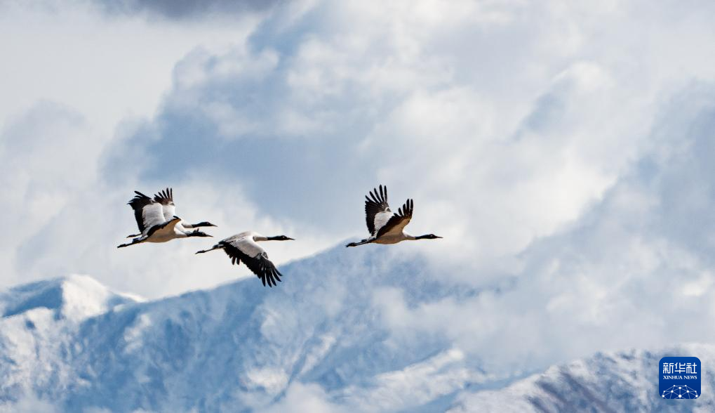 12月8日拍攝的拉薩市林周縣境內(nèi)雪山前飛翔的黑頸鶴。新華社記者 晉美多吉 攝
