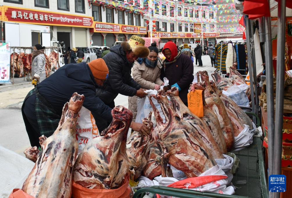 12月13日,在西藏日喀則市康馬縣冬季物資文化交流會(huì)上,當(dāng)?shù)厝罕娫谫?gòu)買羊肉。新華社記者格桑朗杰 攝