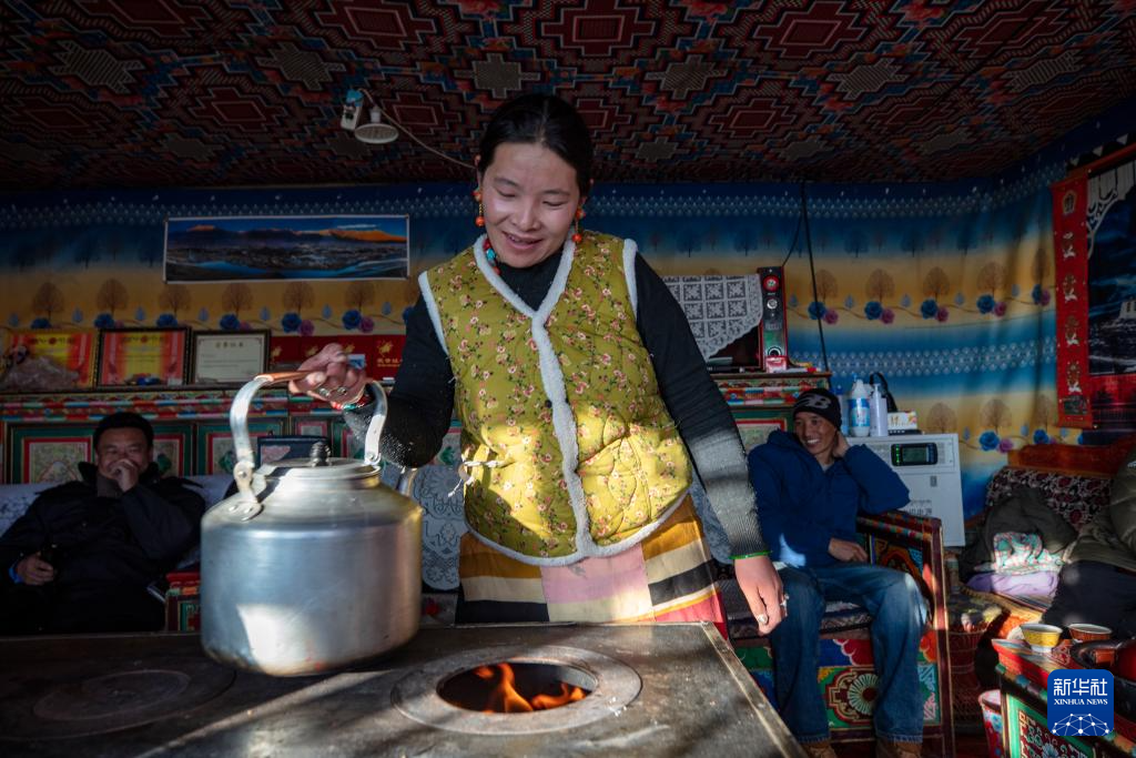 尼瑪縣俄久鄉(xiāng)馬遷村牧民嘎宗在家中的牛糞爐上燒水(12月18日攝)。新華社記者 姜帆 攝