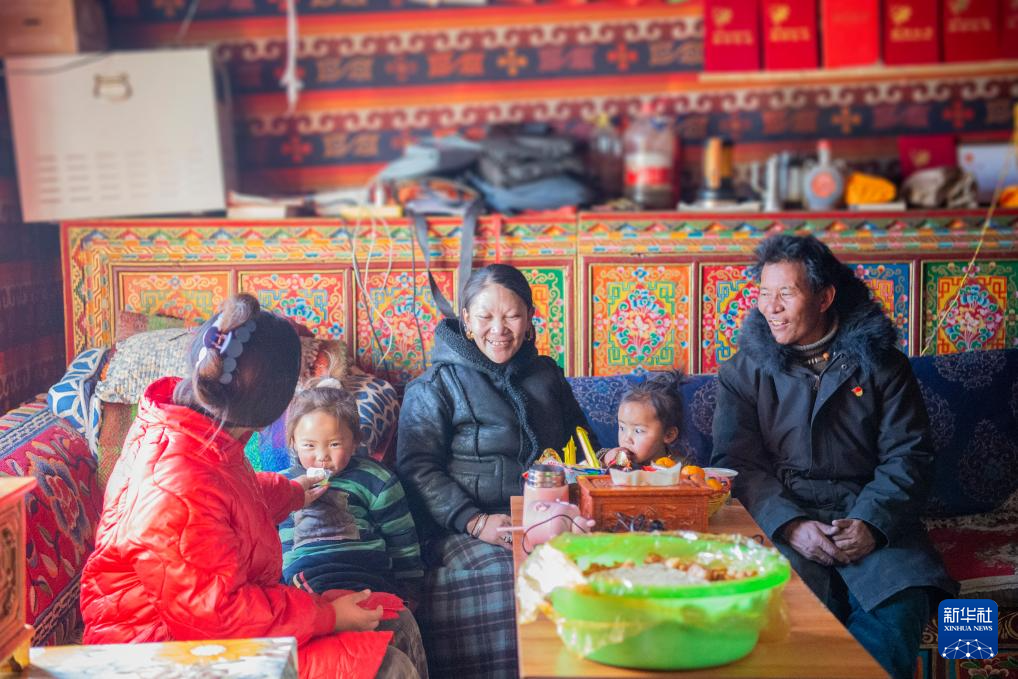 尼瑪縣尼瑪鎮(zhèn)魯根村村民嘎瑪熱杰一家(12月18日攝)。新華社發(fā)(旦增努布攝)