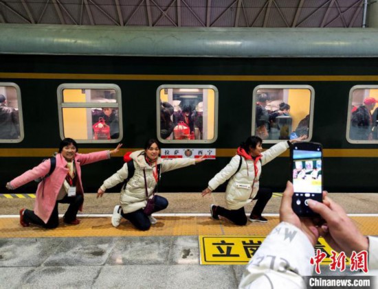 2023年3月1日,乘坐首趟進藏旅游專列的旅客與列車合影。楊紅健 攝