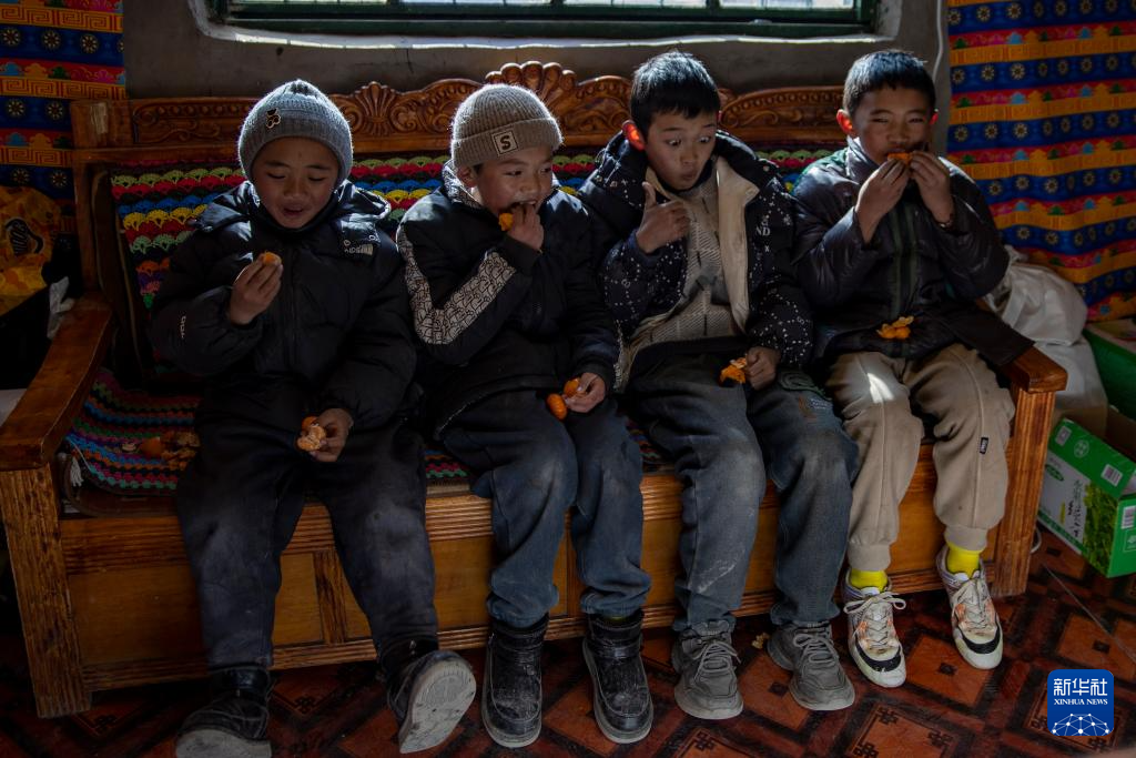 申扎縣馬躍鄉(xiāng)貝嘎四村的幾名小朋友在村里的“偏遠鄉(xiāng)鎮(zhèn)果蔬配送試點項目”直銷點,買來當天供銷合作社配送來的新鮮水果品嘗(1月5日攝)。新華社記者姜帆 攝