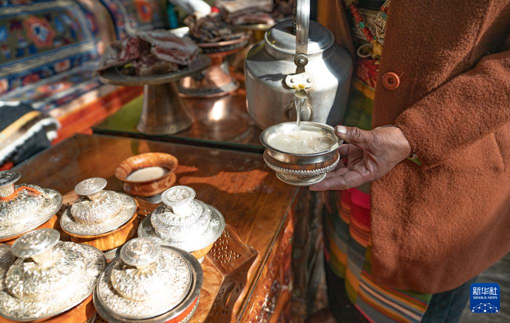 1月12日,巴桑普尺在倒青稞酒。新華社發(fā)(丁增尼達(dá) 攝)