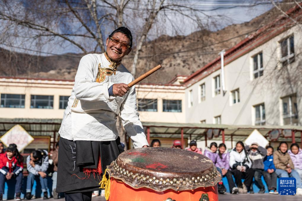 在西藏昌都市洛隆縣碩督鎮(zhèn)小學(xué),鄧巴阿尼在擊鼓伴奏(1月19日攝)。新華社記者 丁增尼達(dá) 攝