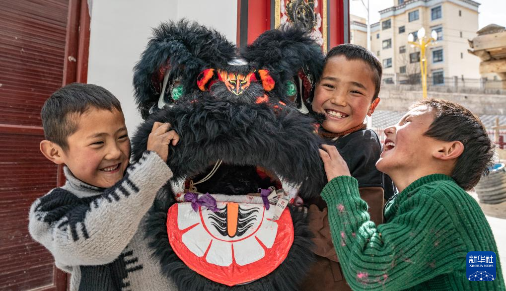 ?在西藏昌都市洛隆縣碩督鎮(zhèn)碩督村,孩子們手捧獅子舞道具玩耍(1月19日攝)。新華社記者 丁增尼達(dá) 攝