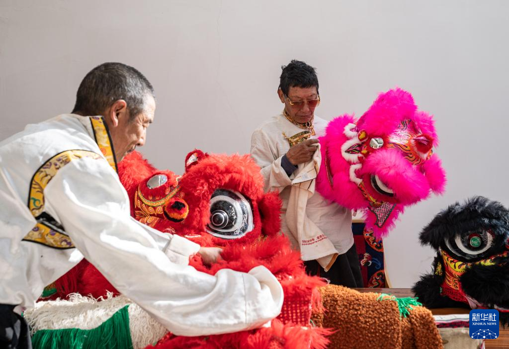 在位于西藏昌都市洛隆縣碩督鎮(zhèn)碩督村的家中,鄧巴阿尼(右)在擦拭獅子舞道具(1月19日攝)。新華社記者 孫非 攝