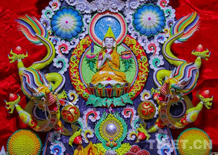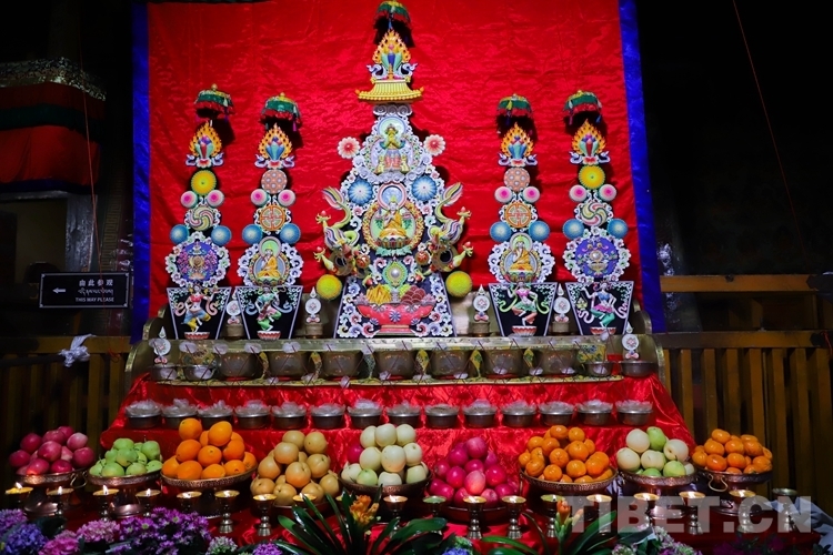 據(jù)了解,每年藏歷正月十五日是藏傳佛教宗教節(jié)日“覺阿卻巴”,即“正月十五供奉節(jié)”。每年這天大昭寺都會(huì)展出精美絕倫的酥油花雕塑,但是雕塑的內(nèi)容每年都有所不同,其內(nèi)容會(huì)有佛祖釋迦牟尼、師徒三尊、吉祥八寶、和睦四瑞等酥油雕塑。