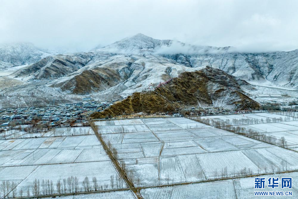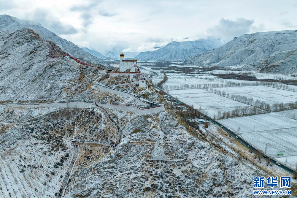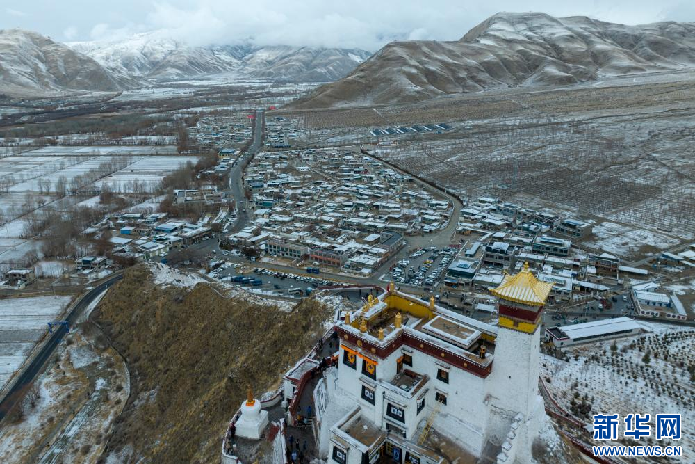 2月15日拍攝的雪后雍布拉康和山腳下的村莊(無人機(jī)照片)。新華網(wǎng) 旦增努布 攝
