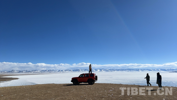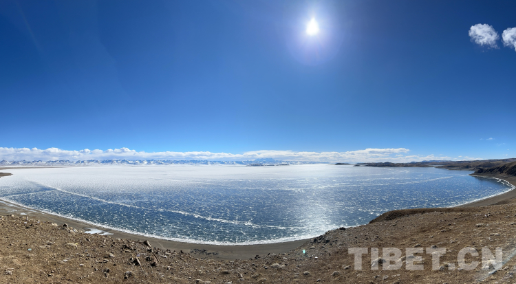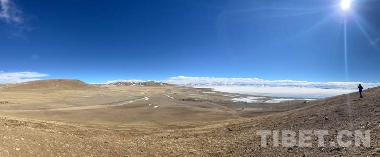 爬上一座山丘,視野陡然明亮開闊起來。原本土黃色的藏北天然牧場高低起伏,黑牦牛零星地散落在山坡,登上高處后,天際圣境納木錯便映入眼簾。初春時節(jié)的拉薩依然春寒料峭,納木錯的落雪還未完全消融,站在高處俯視,這片安靜的大湖被陽光反射得白茫茫一片。更幸運的是碰到了晴好的天氣,白云與湖冰相襯,亦與遠山相接,視線盡頭的念青唐古拉山脈直視無礙,畫面猶如“半池白云半池玉”般頗具美感。