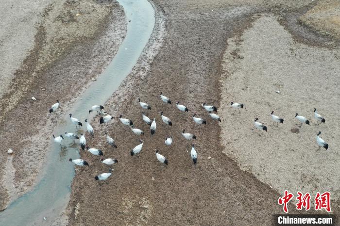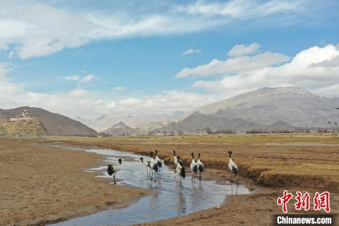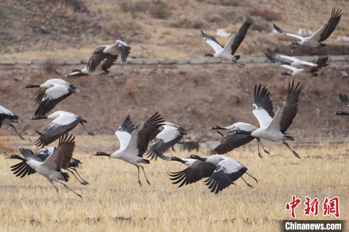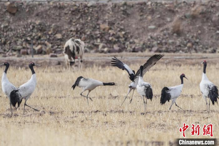 圖為黑頸鶴在林周縣境內的農田里覓食、嬉戲。貢嘎來松 攝