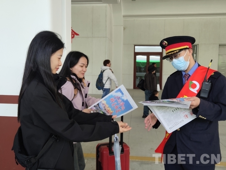 圖為為助力林芝第二十一屆桃花旅游文化節(jié),方便廣大游客了解林芝、觀賞林芝獨(dú)具特色的旅游景點(diǎn),林芝火車(chē)站為到站旅客介紹林芝各縣(區(qū)、市)獨(dú)具特色的景點(diǎn)、美食及賞花旅游攻略,同時(shí)為游客分發(fā)集合相關(guān)交通信息和氣象信息的《林芝報(bào)》。