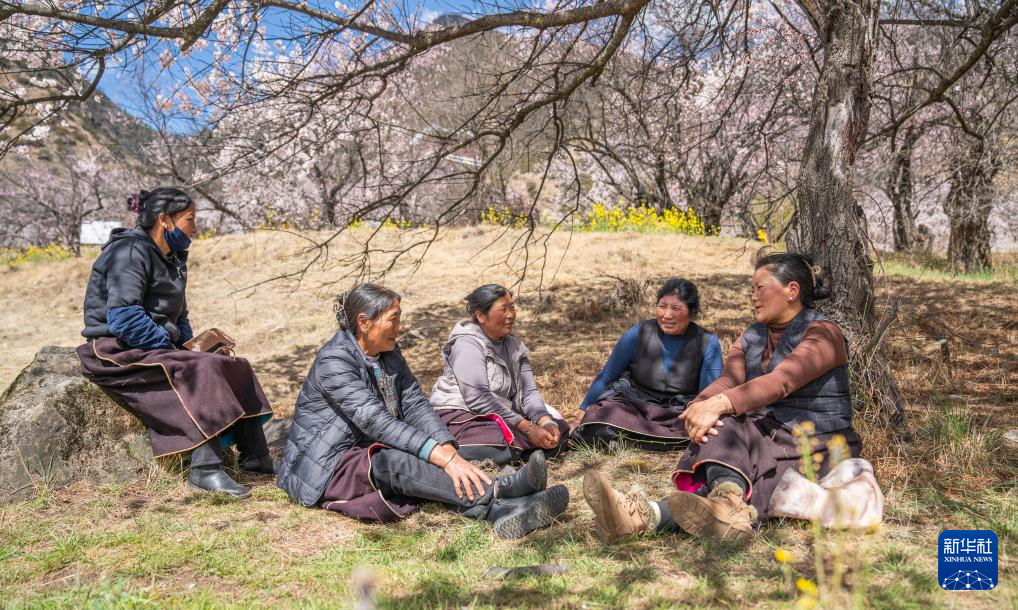 午休時,尼瑪曲吉(右二)與村民在桃樹下聊天(4月1日攝)。新華社記者 丁增尼達(dá) 攝