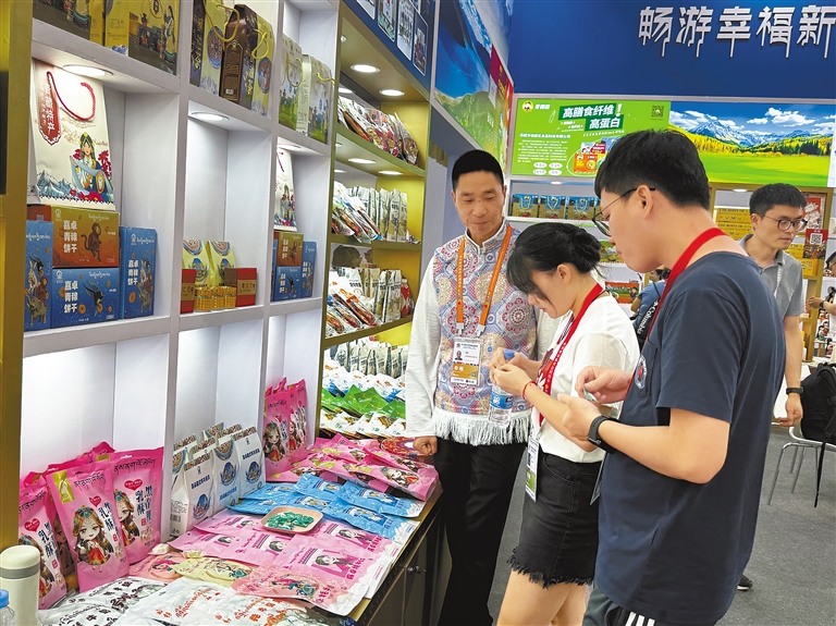 走進(jìn)展館內(nèi),琳瑯滿目、色彩鮮艷的雪域高原特色產(chǎn)品整齊擺放在展館架上,吸引了眾多客商和顧客前來咨詢。