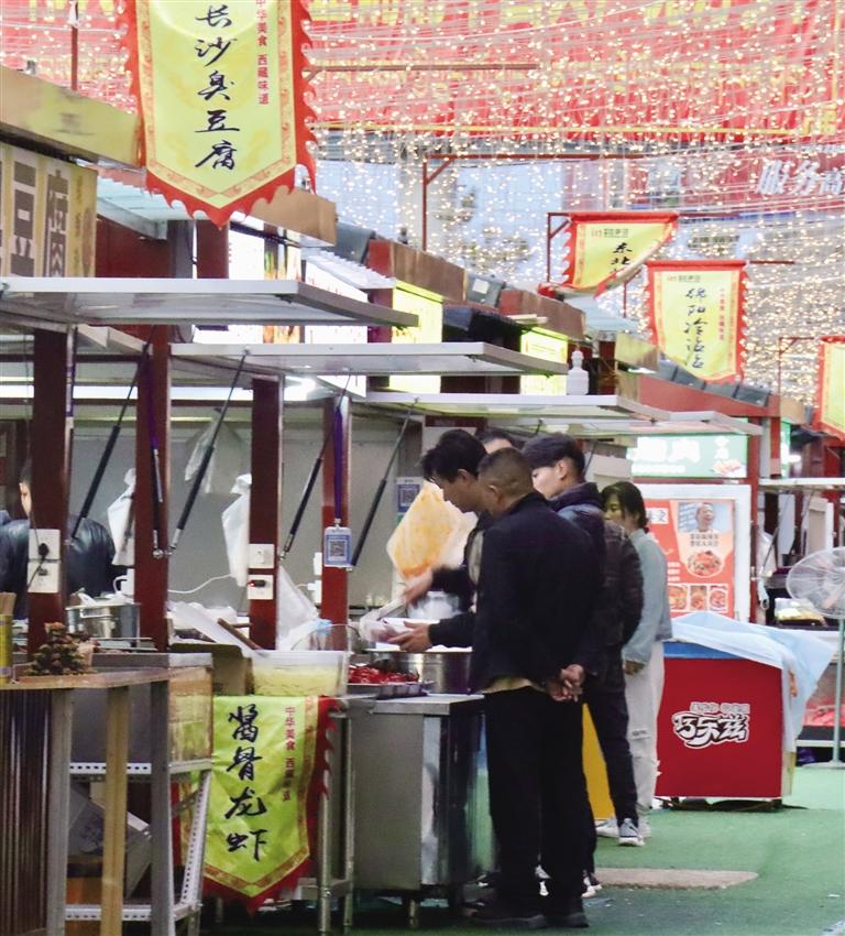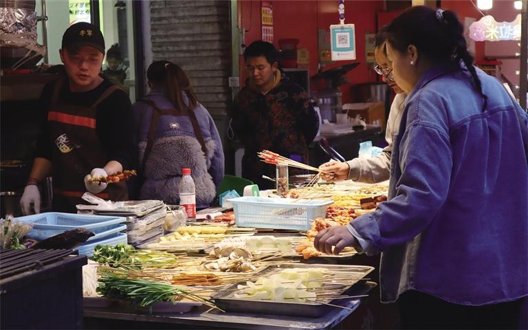 “在明亮寬敞的商場里逛得有些審美疲勞,但又實在留戀夏夜的舒適,所以才來到商場外的金街上,在大大小小的宵夜攤前一邊品嘗著各種美食,一邊談天說笑,感受獨屬于鬧市的人間煙火。”市民達珍開心地說?!?/p>