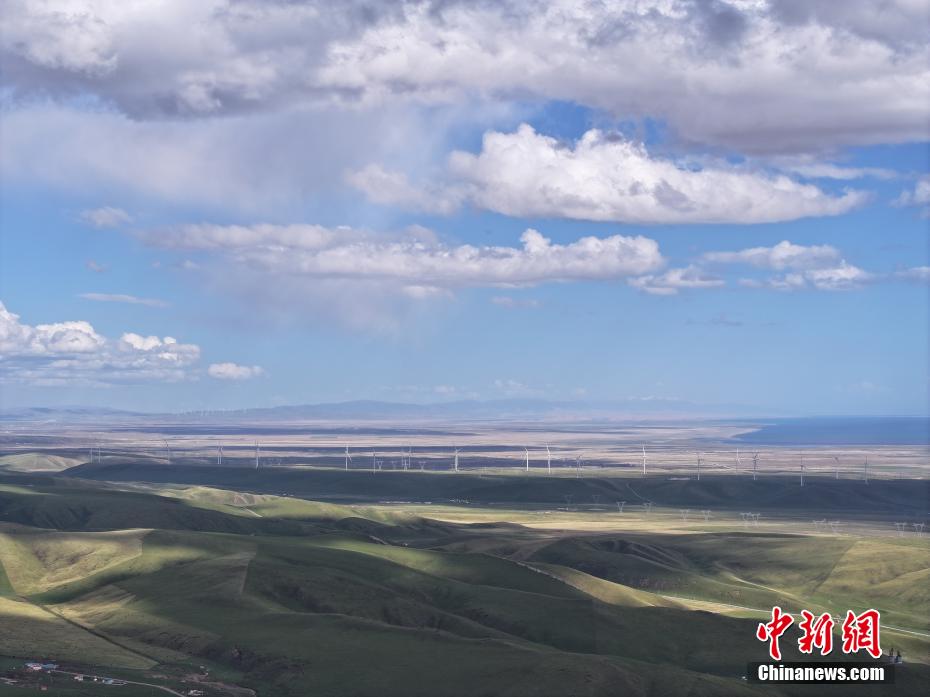 6月4日,航拍青海省海北藏族自治州剛察縣夏日草原秀美風(fēng)光。地處青海湖北岸的剛察縣,被稱作“海濱藏城”,夏日,連綿的草原綠草萋萋,成群牛羊在山間覓食,遠(yuǎn)處的青海湖水天一色,若隱若現(xiàn),風(fēng)光秀美。(無(wú)人機(jī)照片)馬銘言 攝