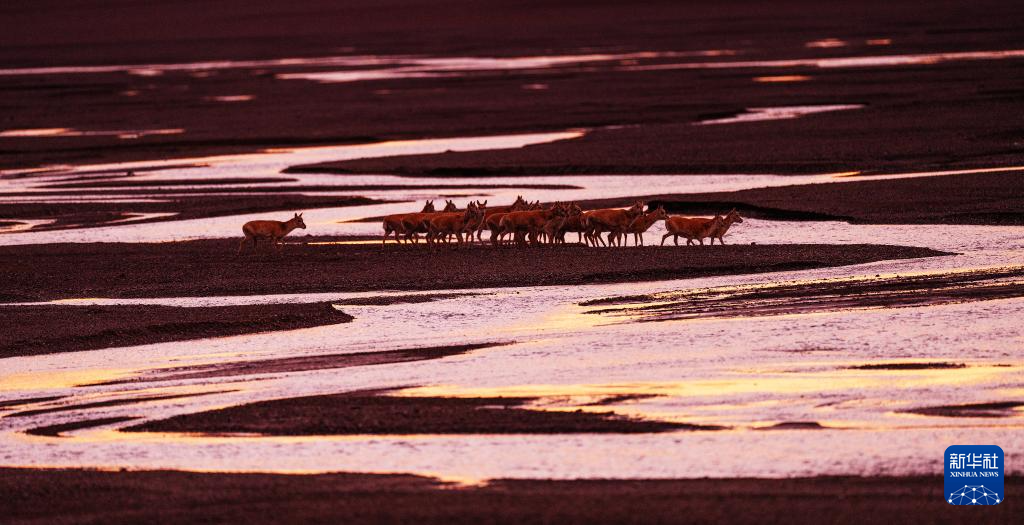 6月13日傍晚,在羌塘國家級自然保護區(qū),遷徙中的母藏羚羊越過甜水河。新華社記者 費茂華 攝