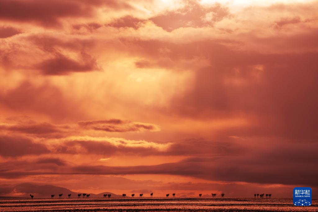 6月13日傍晚在羌塘國家級自然保護區(qū)拍攝的遷徙中的藏羚羊。新華社記者 費茂華 攝