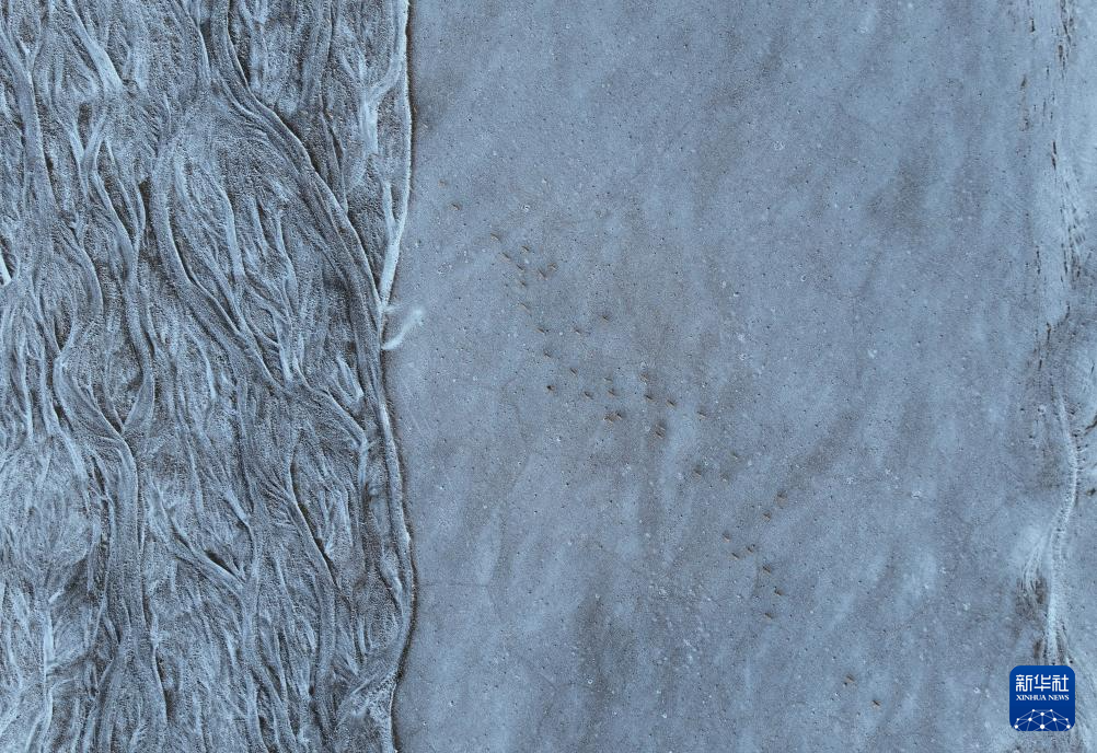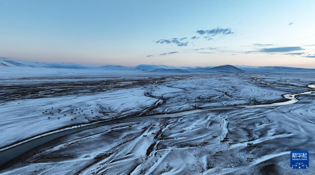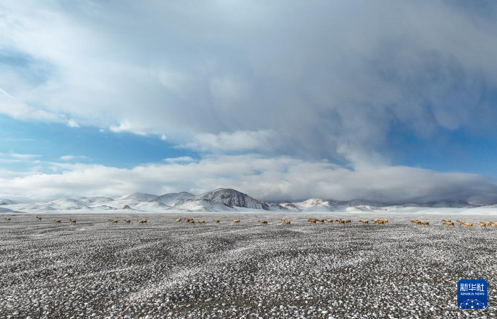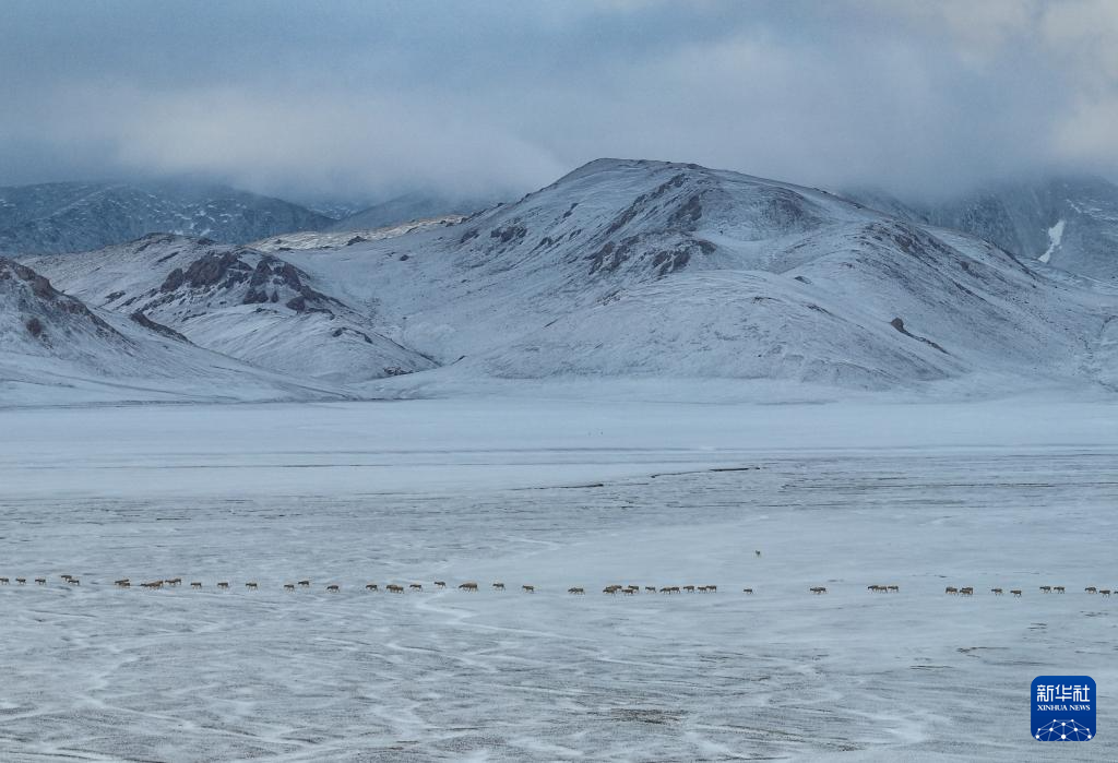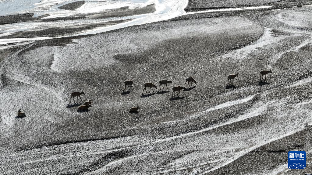 在甜水河畔荒灘雪地中向產(chǎn)羔地遷徙的藏羚羊(6月15日攝,無人機照片)。新華社記者 晉美多吉 攝