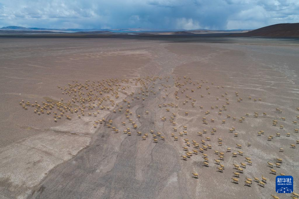 遷徙途中的藏羚羊(6月13日攝,無人機照片)。新華社記者 旦增尼瑪曲珠 攝