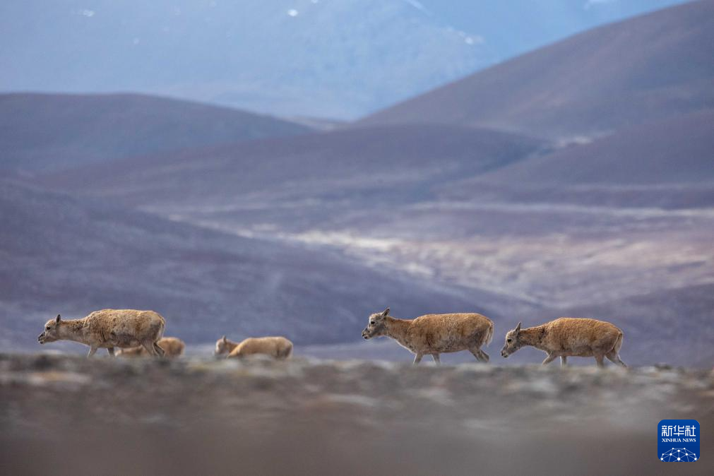 幾只公藏羚羊守護母藏羚羊前進(5月8日攝)。新華社記者 姜帆 攝