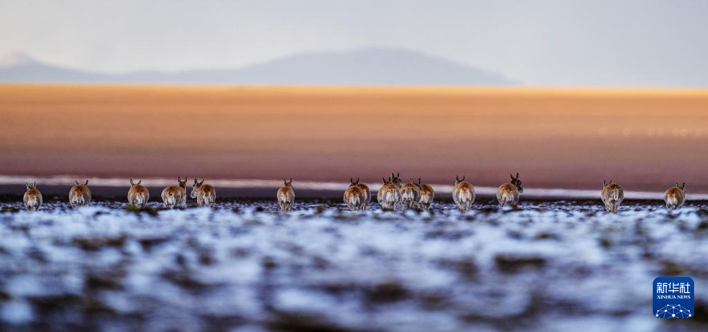 6月15日清晨雪后,在羌塘國家級自然保護區(qū),迎著朝霞前行在遷徙路上的一群藏羚羊。新華社記者 費茂華 攝
