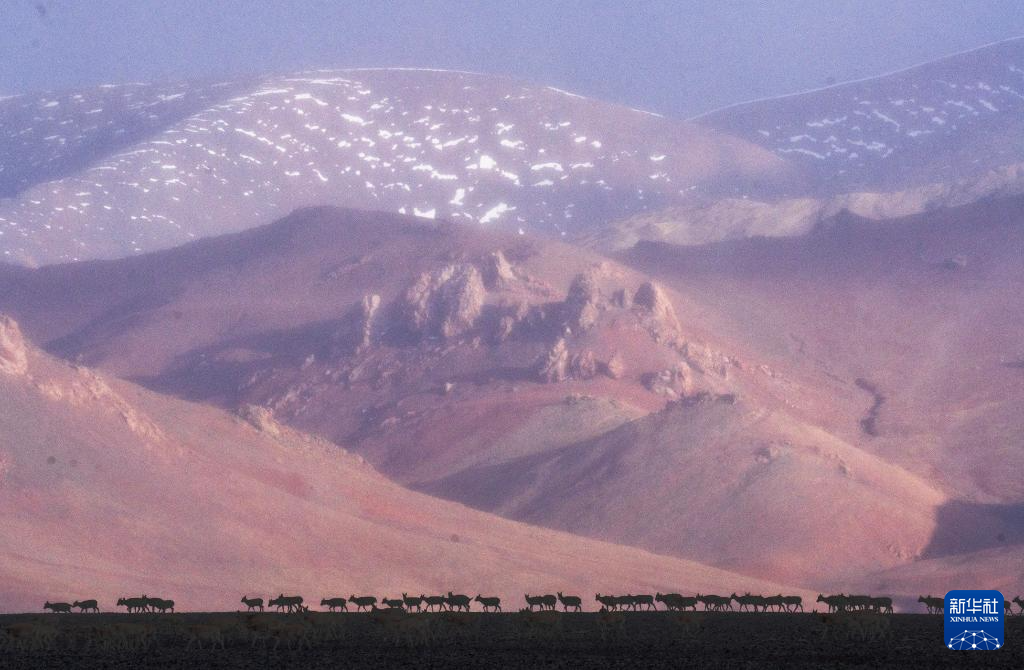 大群遷徙的藏羚羊翻越覆蓋著積雪的山梁(5月10日攝)。新華社記者 姜帆 攝