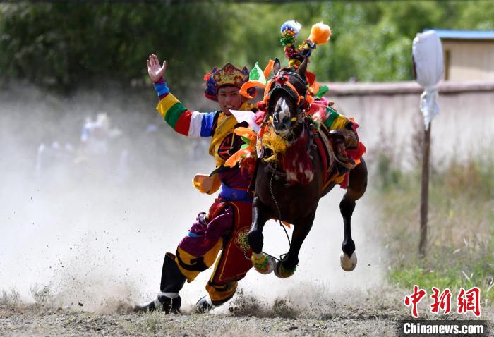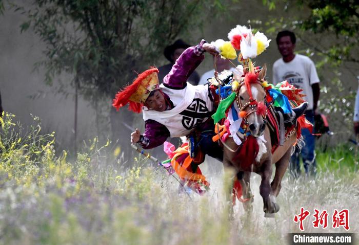 7月27日,西藏拉薩市桑達(dá)村迎來(lái)“望果節(jié)”,村民們舉行賽馬活動(dòng)慶祝?!巴?jié)”是西藏傳統(tǒng)的豐收節(jié),具體日期隨各地莊稼成熟的時(shí)間而變化?!巴?jié)”期間,按照習(xí)俗,各地都會(huì)舉辦賽馬比賽。圖為騎手進(jìn)行馬術(shù)表演。中新社記者 李林 攝