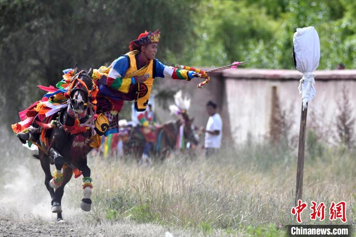 7月27日,西藏拉薩市桑達(dá)村迎來(lái)“望果節(jié)”,村民們舉行賽馬活動(dòng)慶祝。“望果節(jié)”是西藏傳統(tǒng)的豐收節(jié),具體日期隨各地莊稼成熟的時(shí)間而變化。“望果節(jié)”期間,按照習(xí)俗,各地都會(huì)舉辦賽馬比賽。圖為騎手進(jìn)行馬上射箭表演。中新社記者 李林 攝