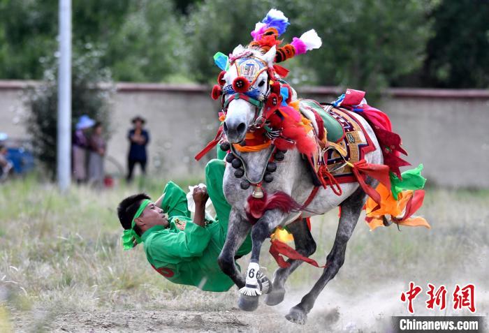 7月27日,西藏拉薩市桑達(dá)村迎來(lái)“望果節(jié)”,村民們舉行賽馬活動(dòng)慶祝。“望果節(jié)”是西藏傳統(tǒng)的豐收節(jié),具體日期隨各地莊稼成熟的時(shí)間而變化。“望果節(jié)”期間,按照習(xí)俗,各地都會(huì)舉辦賽馬比賽。圖為騎手進(jìn)行馬術(shù)表演。中新社記者 李林 攝