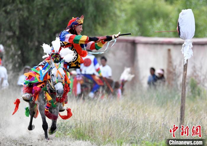 7月27日,西藏拉薩市桑達(dá)村迎來(lái)“望果節(jié)”,村民們舉行賽馬活動(dòng)慶祝?!巴?jié)”是西藏傳統(tǒng)的豐收節(jié),具體日期隨各地莊稼成熟的時(shí)間而變化。“望果節(jié)”期間,按照習(xí)俗,各地都會(huì)舉辦賽馬比賽。圖為騎手進(jìn)行馬上射擊表演。中新社記者 李林 攝