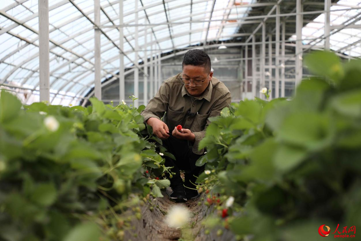 圖為才納園區(qū)工作人員在草莓采摘區(qū)采摘草莓。人民網(wǎng)記者 次仁羅布攝