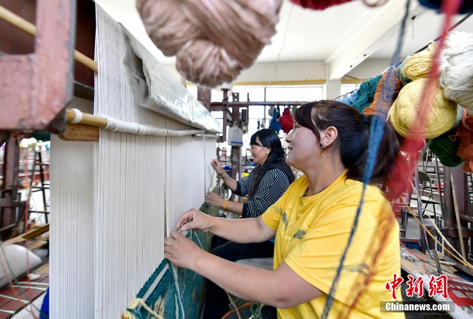 藏毯是世界三大名毯之一,以艷麗的色彩、濃厚的民族風(fēng)格、鮮明的地域特色聞名遐邇。圖為8月16日,西藏拉薩的一家藏毯廠里,巧手的工人們用傳統(tǒng)藏式手工打結(jié)法將五顏六色的羊毛線編織成圖案精美的藏毯。中新社記者 李林 攝