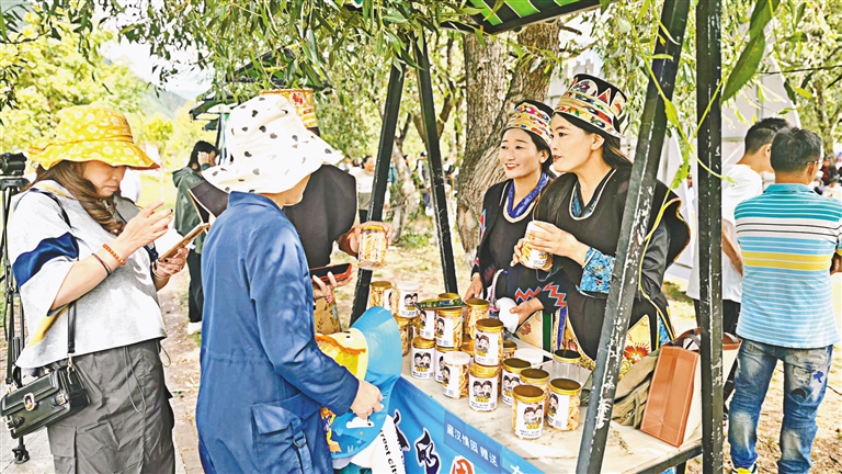 圖為林卡主題音樂會(huì)上,工作人員為市民、游客介紹農(nóng)特產(chǎn)品。