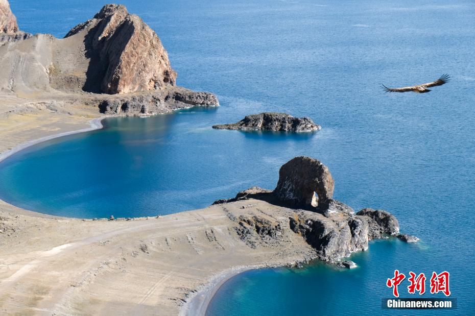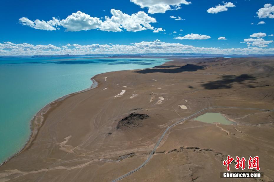 國慶期間,中新網(wǎng)記者自駕西藏藏北羌塘草原,途經(jīng)“天湖”納木錯,高原鹽湖班戈湖以及西藏第一大湖色林錯等地。秋天高原藍(lán)天白云的映襯下,藏北湖泊猶如一面面巨大的“寶石藍(lán)”鏡子鑲嵌于高原大地,景色壯麗。圖為10月2日,航拍西藏第一大湖色林錯北岸風(fēng)光。記者 江飛波 攝