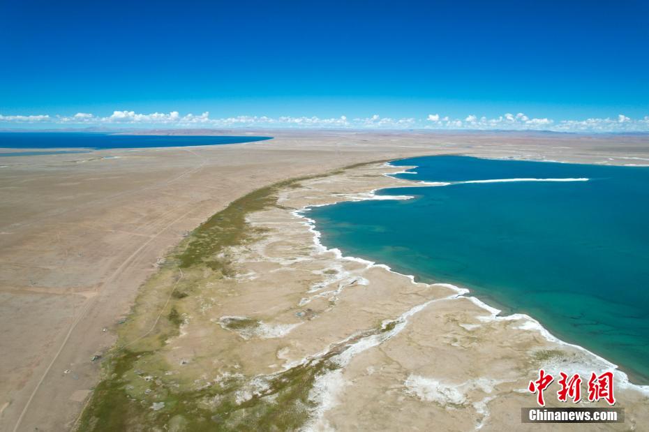 國慶期間,中新網(wǎng)記者自駕西藏藏北羌塘草原,途經(jīng)“天湖”納木錯,高原鹽湖班戈湖以及西藏第一大湖色林錯等地。秋天高原藍(lán)天白云的映襯下,藏北湖泊猶如一面面巨大的“寶石藍(lán)”鏡子鑲嵌于高原大地,景色壯麗。圖為10月2日,西藏班戈縣班戈湖,畫面左上角為色林錯。記者 江飛波 攝