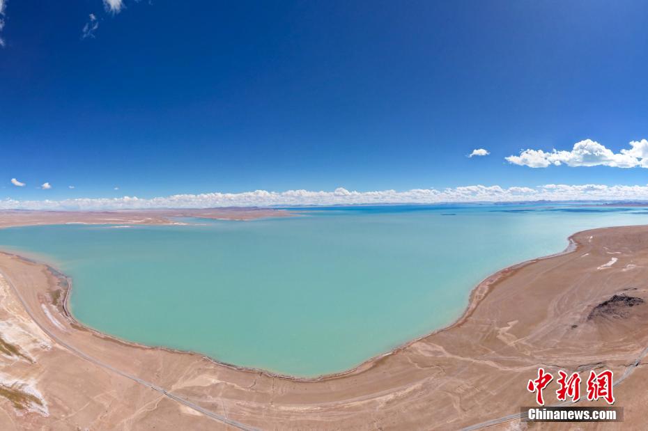 國慶期間,中新網(wǎng)記者自駕西藏藏北羌塘草原,途經(jīng)“天湖”納木錯,高原鹽湖班戈湖以及西藏第一大湖色林錯等地。秋天高原藍(lán)天白云的映襯下,藏北湖泊猶如一面面巨大的“寶石藍(lán)”鏡子鑲嵌于高原大地,景色壯麗。圖為10月4日,航拍西藏色林錯水天相接。記者 江飛波 攝