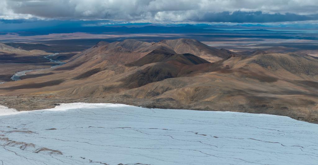 這是9月4日拍攝的普若崗日冰原8號(hào)冰川、消融形成的徑流以及遠(yuǎn)處的令戈錯(cuò)(無(wú)人機(jī)拼接照片)。新華社記者 姜帆 攝