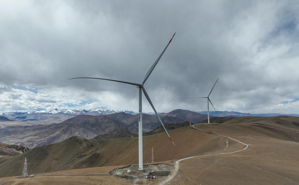10月17日拍攝的位于西藏日喀則市薩迦縣的風(fēng)力發(fā)電機(jī)組(無(wú)人機(jī)照片)。新華社記者 晉美多吉 攝 ??