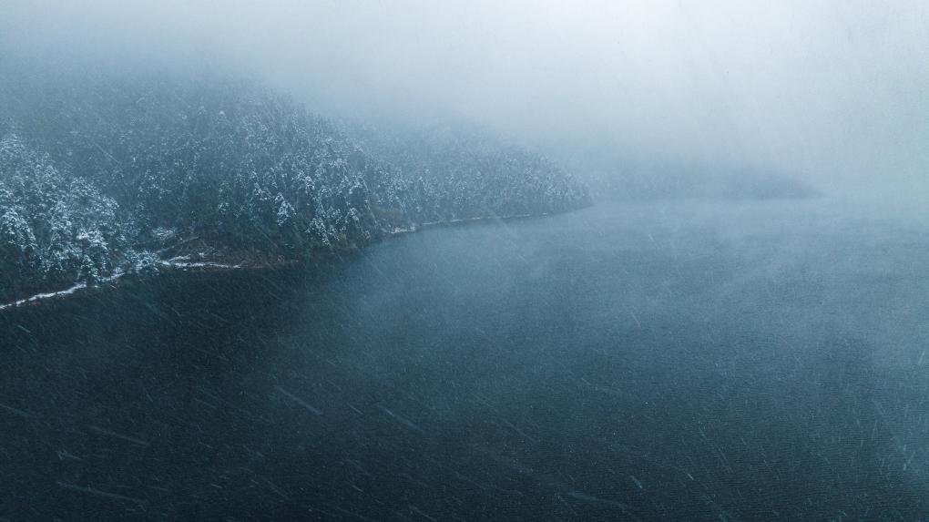 風(fēng)雪中的措木及日景區(qū)(無(wú)人機(jī)照片,10月20日攝)。措木及日位于西藏林芝市八一鎮(zhèn)市郊,是一座古冰磧湖。新華社記者 丁增尼達(dá) 攝 ??
