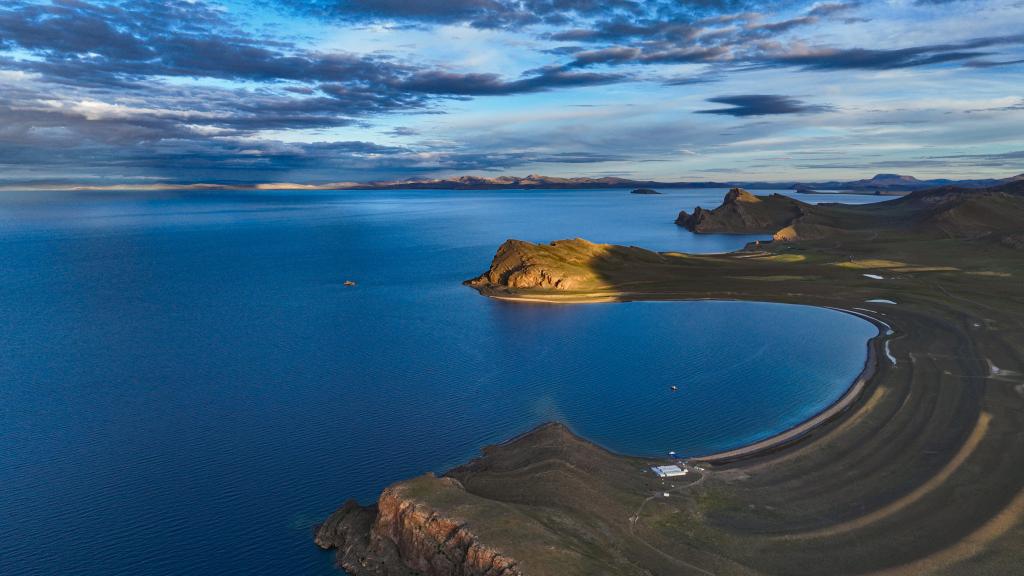 7月11日傍晚的納木錯(cuò)湖畔(無(wú)人機(jī)照片)。新華社記者 晉美多吉 攝 ??
