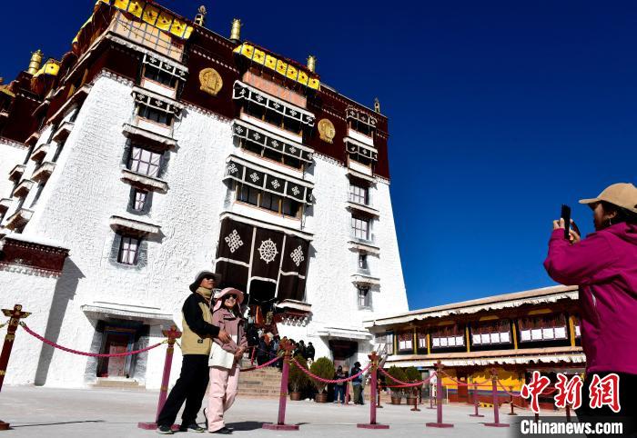 隨著2024冬游西藏的啟動(dòng),西藏所有A級(jí)景區(qū)(寺廟景區(qū)除外)免費(fèi)游覽,布達(dá)拉宮也成為冬游西藏?zé)衢T游覽地之一。圖為11月1日,來自四川的信眾在布達(dá)拉宮拍照留念。中新社記者 李林 攝