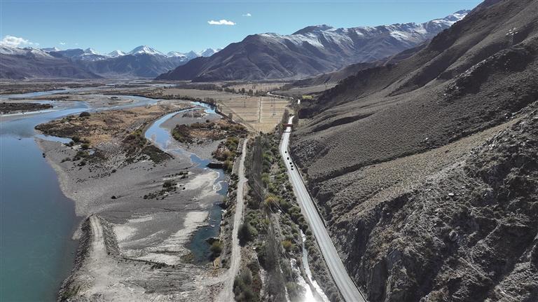 從拉薩市區(qū)出發(fā),沿著G318一路向西,車(chē)輛行駛在寬闊的大道上。江水靜靜流淌,遠(yuǎn)處的雪山在晨光中若隱若現(xiàn),與近處錯(cuò)落有致的藏式建筑交相輝映。道路兩旁滿是金黃色的樹(shù)木,車(chē)輛穿梭在金色的大道上,落葉在地面旋轉(zhuǎn)飛舞,仿佛進(jìn)入時(shí)空隧道一般。