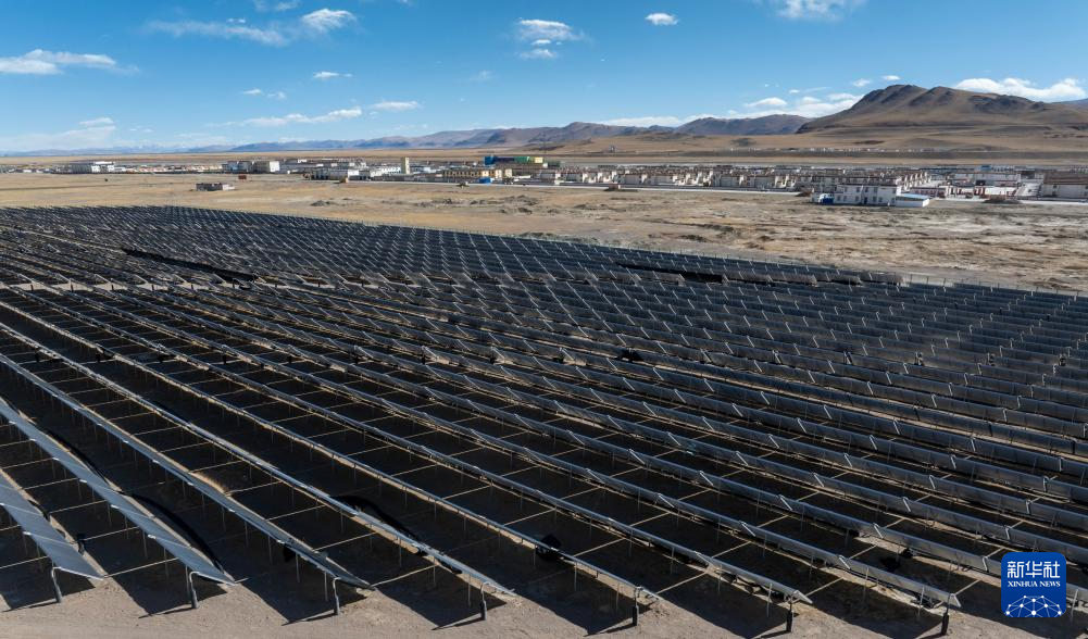 鳥瞰措勤縣城區(qū)清潔能源集中供暖特許經(jīng)營(yíng)項(xiàng)目的光伏陣列(無人機(jī)照片,11月20日攝)。新華社記者 姜帆 攝 ??