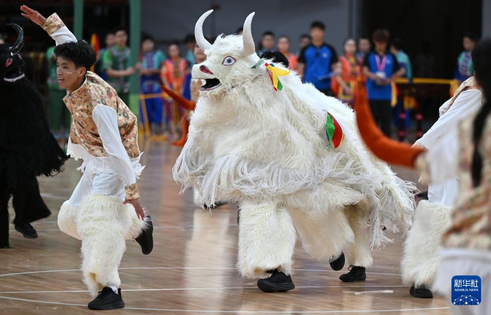 音樂(lè)響起,身著藏式服裝的孩子們與身披毛氈、扮演牦牛的孩子們沖進(jìn)場(chǎng)內(nèi),或跳起熱情奔放的舞蹈,或模仿著牦牛的動(dòng)作與形態(tài),時(shí)而奔騰,時(shí)而對(duì)峙,飽含力量的動(dòng)作與吶喊呈現(xiàn)著來(lái)自雪域高原的勇猛與堅(jiān)韌,展現(xiàn)人與自然和諧共處的生動(dòng)景象,也讓體育館內(nèi)每一位觀眾都能感受到他們對(duì)民族傳統(tǒng)體育文化的熱愛(ài)與自豪。