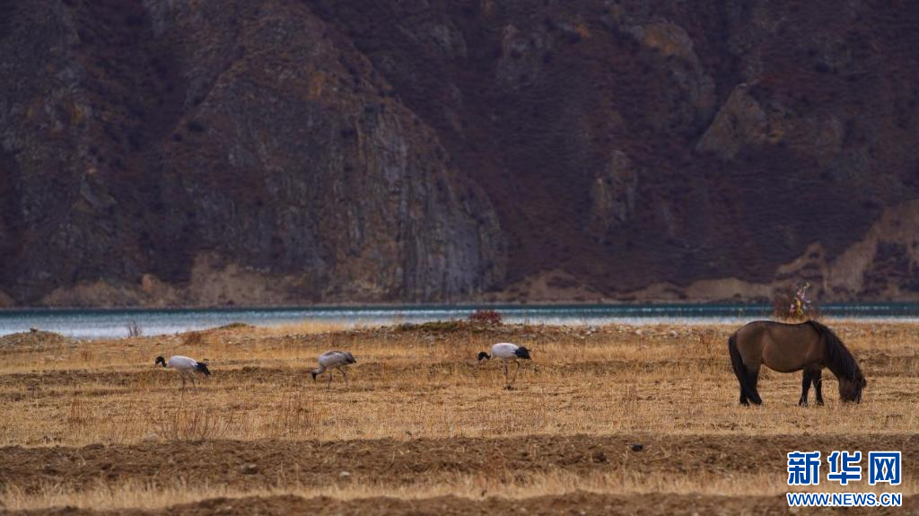 圖為湖邊的黑頸鶴與牦牛(11月24日攝)。新華網(wǎng)發(fā) 嘎色攝 ??