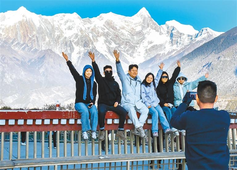 圖為12月13日,游客在米林市索松村觀景臺(tái)與南迦巴瓦峰合影。記者 劉楓 王珊 攝