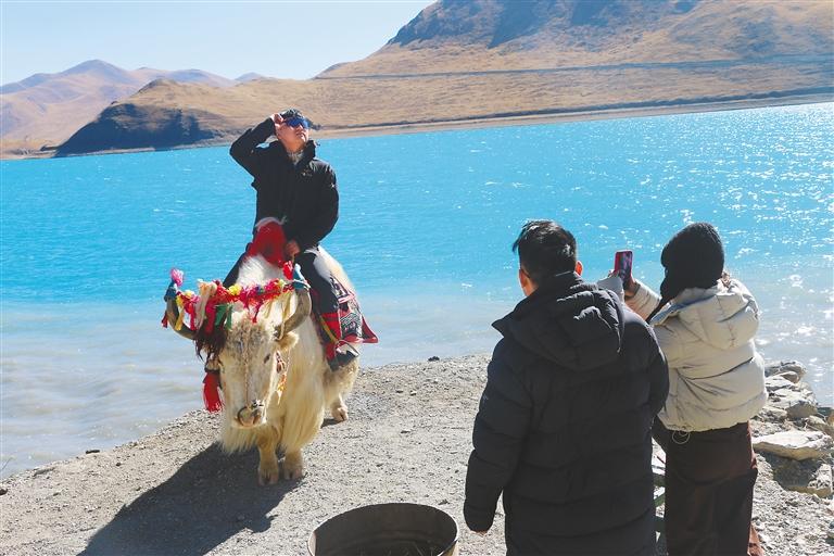 圖為近日在羊卓雍錯(cuò)岸邊,游客騎在牦牛上拍照打卡。記者 武沛濤 孫開(kāi)遠(yuǎn) 攝
