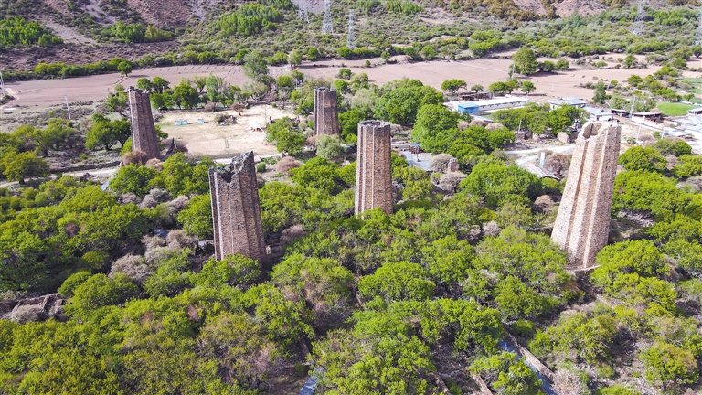 這些堡壘通體呈土黃色、棕褐色,主要由片石、木頭壘砌而成,內(nèi)部嵌有木梁,既起到了支撐作用,又能供人攀爬至堡頂。堡壘墻厚2米,從基部到頂部逐步縮小,中間空洞,沒有頂蓋,周身有對稱的孔洞,內(nèi)部呈八角狀,外觀則棱角分明,呈現(xiàn)出十二面十二棱的棱柱狀,造型設(shè)計巧妙牢固且氣勢恢宏,彰顯了千年以前青藏高原上高超的建筑技藝。