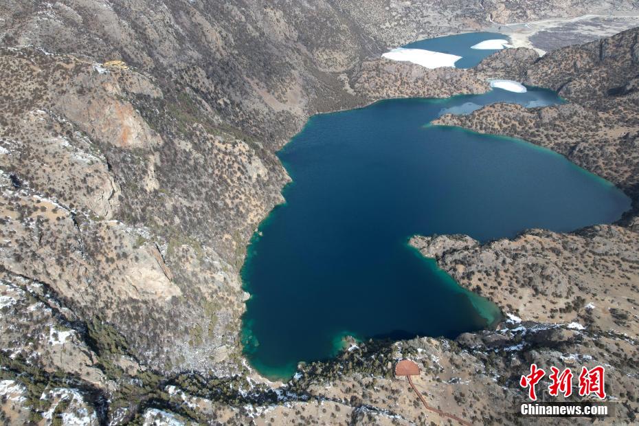2月16日,位于西藏昌都市邊壩縣的“三色湖”在群山環(huán)抱中景色壯美?!叭庇珊诤?、白湖、黃湖組成,群山環(huán)抱中的三處相鄰湖泊在陽光下分別呈現(xiàn)不同色彩。圖為三色湖景色。中新社記者 李林 攝(無人機(jī)照片)