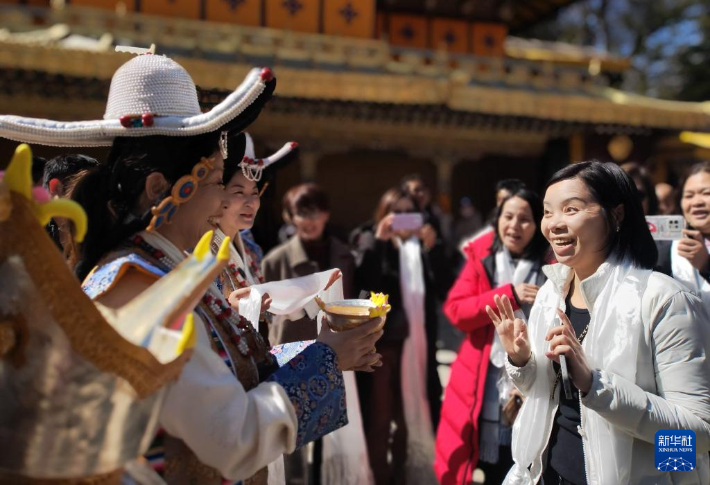 2月20日,歡迎儀式上當(dāng)?shù)赜e人員為香港游客敬獻(xiàn)香甜的青稞酒。 新華社記者 春拉 攝